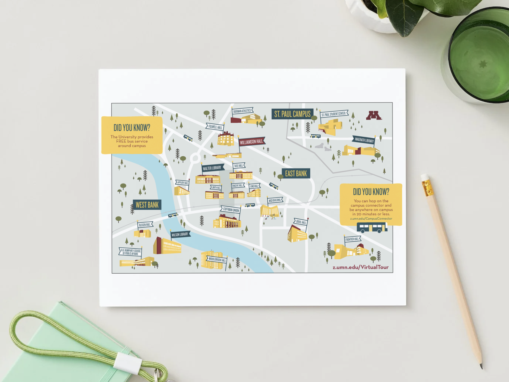 An new admissions package designed to excite. The envelope sets the tone with Goldy the Gopher front and center. Inside, a redesigned admissions booklet walks students through important information, with separate versions for freshman and transfer students. A hand-illustrated campus map adds character and helps make the place feel real. Stickers bring in a sense of celebration and built to spark school pride the moment it arrives.